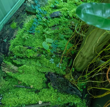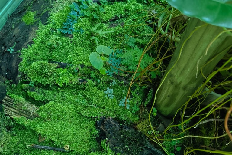 In the terrarium: Baby Tears creates a lush carpet effect that softens everything it touches. Hydrocotyle trails delicately between other plants and produces tiny white flowers in a well-established build — a lovely surprise. Frog Vine climbs wood, glass, and hardscape beautifully; the tiny leaves genuinely do look like little frogs clinging to surfaces — once you see it, you can't unsee it.
